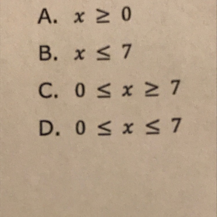 So x = 0 is the smallest x can be and x = 7 is the largest x can be. This means the domain is