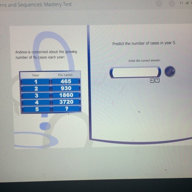 The number is doubling each year so in year 5 there will be 3720*2 = 7440 flu cases