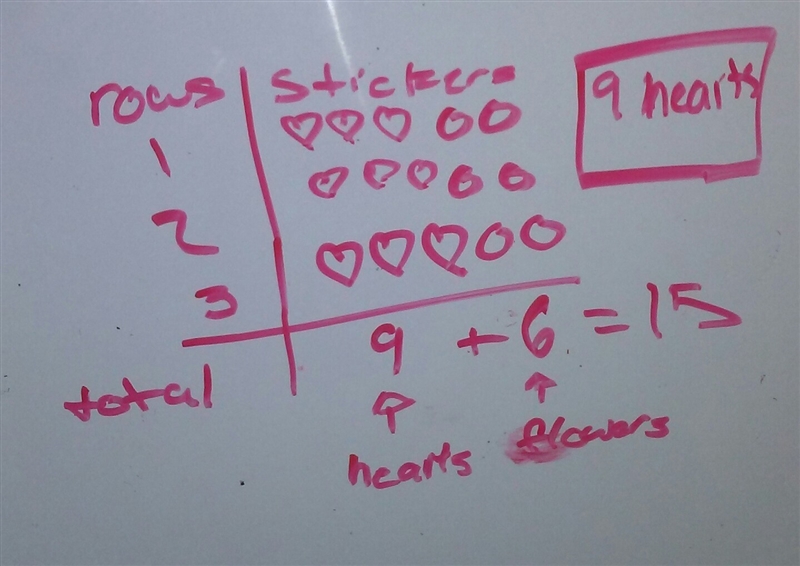 maya has 15 stickers . she places them on a page in rows of 5 . there are 2 flowers and 3 hearts in each row . how many hearts are on the page ? Draw to solve the problem . Write how many hearts are on the page