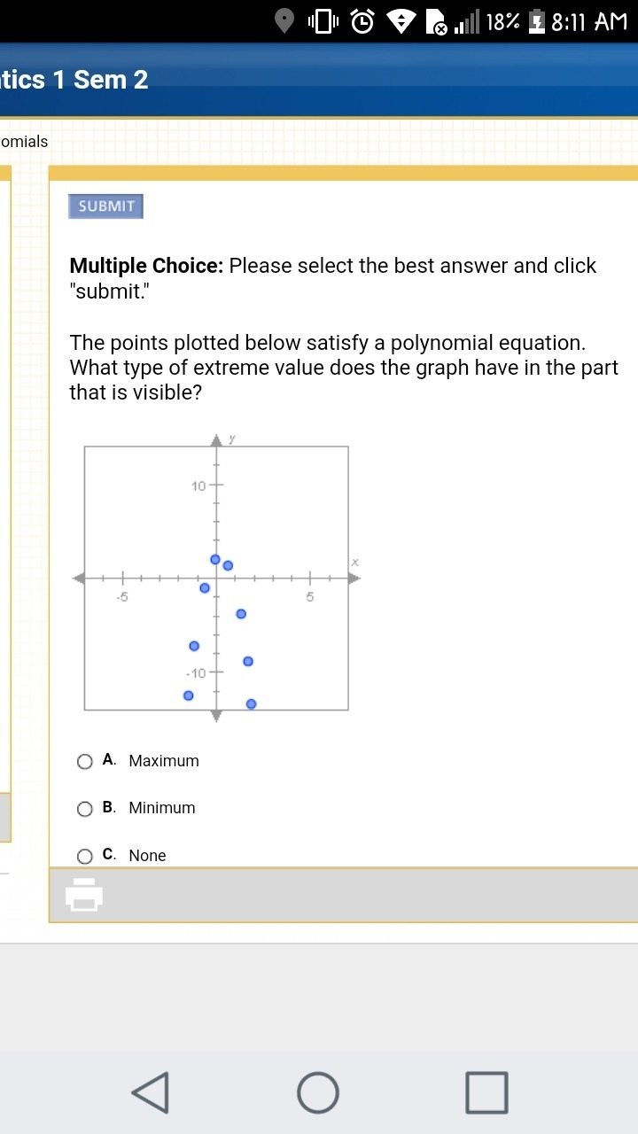 The points plotted below satisfy a polynomial equation. What type of extreme value-example-1