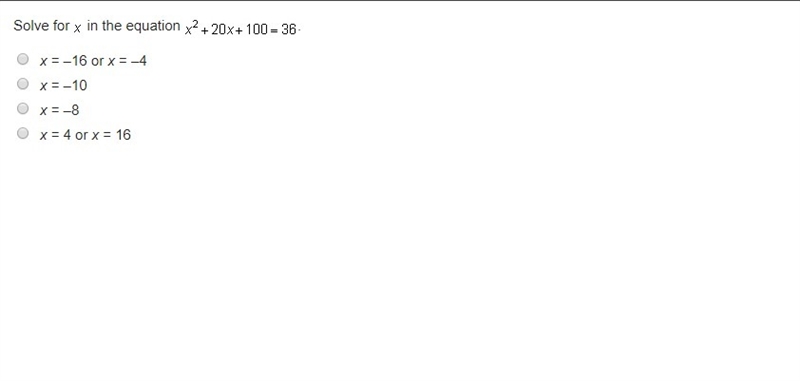 x ^ 2 + 20x + 100 = 36