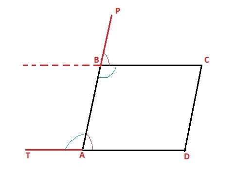 Step 4: Angles PBC and BAD are congruent by the Corresponding Angles Theorem. ( If two parallel lines are cut by a transversal, then the pairs of corresponding angles are congruent. Corresponding angles are the angles which occupy the same relative position at each intersection where a straight line crosses two others.)