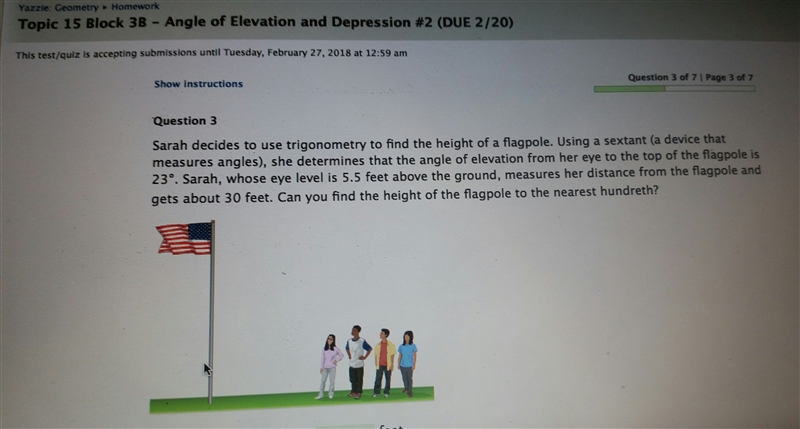 The height would be 30tan23 + 5.5 which is 18.23 ft.