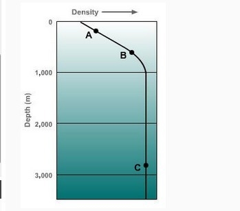 PLEASE HELP FAST!! According to the density profile shown here, at which depth would you find the coolest, saltiest waters? A. depth B B. depth A C. depth C D. You cannot tell f…