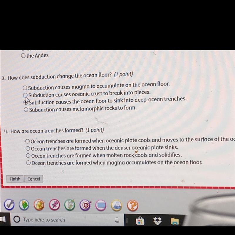Ocean trenches are formed by subduction, a geophysical process in which two or more of Earth's tectonic plates converge and the older, denser plate is pushed beneath the lighter plate and deep into the mantle, causing the seafloor and outermost crust (the lithosphere) to bend and form a steep, V-shaped depression.