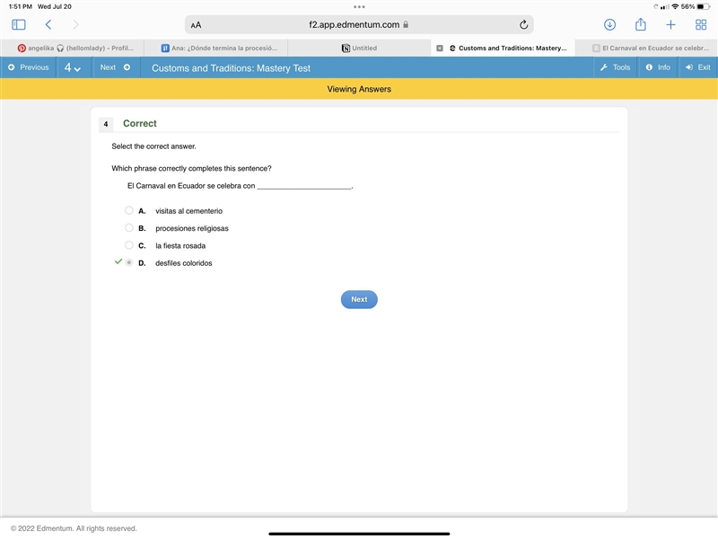 El Carnaval en Ecuador se celebra con _______________________. A. visitas al cementerio B. procesiones religiosas C. la fiesta rosada D. desfiles coloridos
