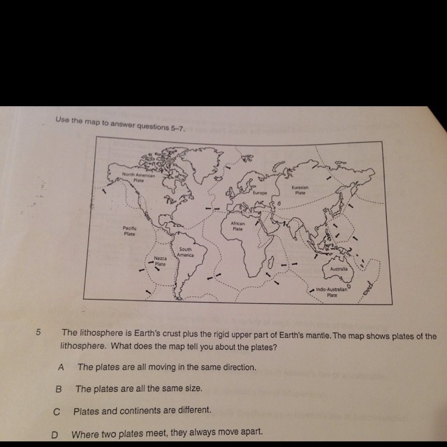 I believe the answer is C) there is an obvious reasoning for this all you have to do is eliminate answers that don't seem right for example, A)the plates are all moving the same direction every plate moves in different directions. B) The plates are all the same size. Well, it's really obvious that that is not true because every plate has its different shape and size. D) where two plates meet, they always move apart. If this were true, then we would never have earthquakes when plates meet earthquakes happen. so there for the answer is C)