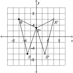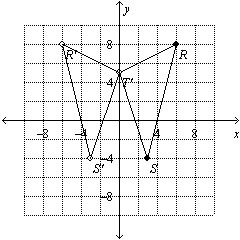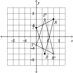 Graph with vertices R(6, 6), S(3, –6), and T(0, 3) and its image after a reflection over the y-axis.