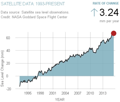 The chart shows changes in sea level from 1995 to 2013. According to the chart, sea levels rose at an average annual rate of 3.24 millimeters from 1995 to 2013. Which questions can be asked to check whether global warming is the cause of rising sea levels?
