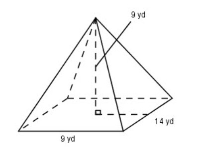 What is the volume of the pyramid to the nearest whole unit? A. 1,134 yd^3 B. 567 yd^3 C. 378 yd^3 D. 284 yd^3