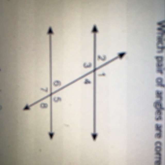 Which pair of angles are corresponding angles? 1 and 2 1 and 7 2 and 6 2 and 7