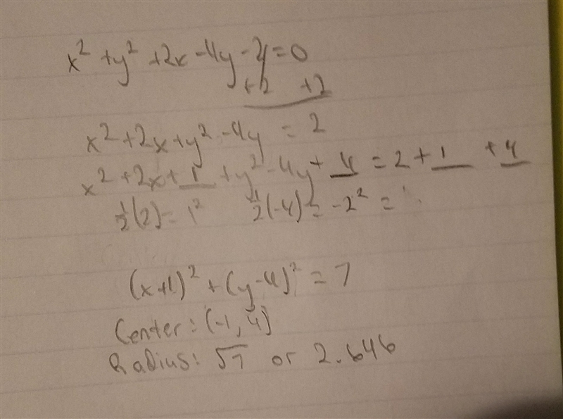What is the radius and center of this circle? {x}^(2) + {y}^(2) + 2x - 4y - 2 = 0