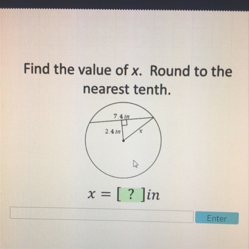 the other leg is 7.4/2=3.7 in (radius)