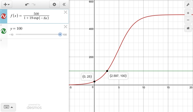 When x=0, you have 500/(1 +19) = 25. The initial value is 25, not 20.