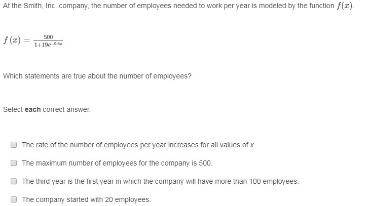 The rate of increase slows once there are more than 250 employees. (The nature of a "logistic function" such as this is that it is (approximately) exponentially increasing until half the "carrying capacity" of the resource, then is exponentially decreasing as it approaches the limit.)