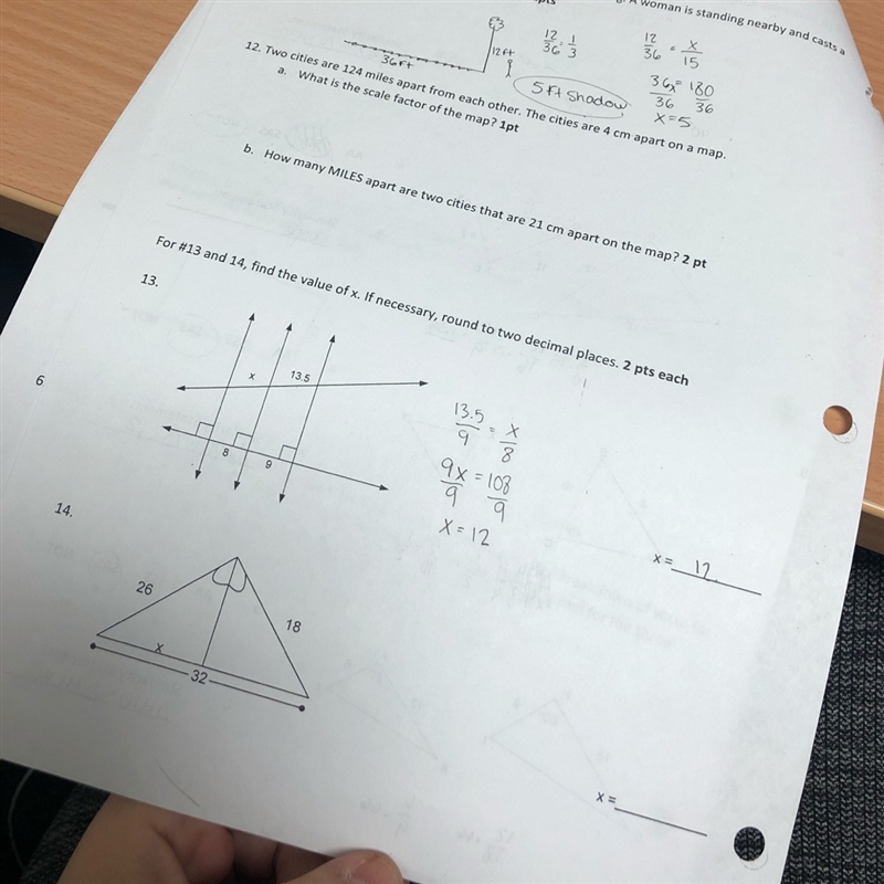 (13.5/9)=(x/8)--------------> x=(13.5/9)*8-----------> x=12 units