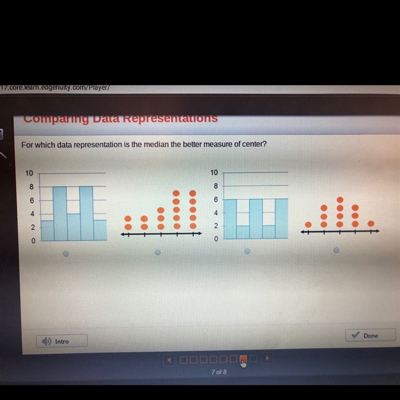 However, in the second graph the data is skewed to the right. This means that the mean would also be skewed to the right due to the larger scores there. Using the median in this case would give a clearer picture of the data.
