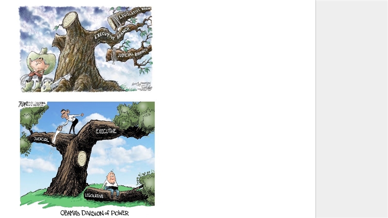 answer: According to the cartoons, the common fear of the executive branch will over power the legislative and judicial branches.