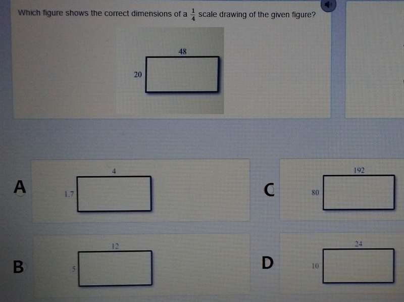 the correct dimensions of a 1/4 scale drawing of the given figure is