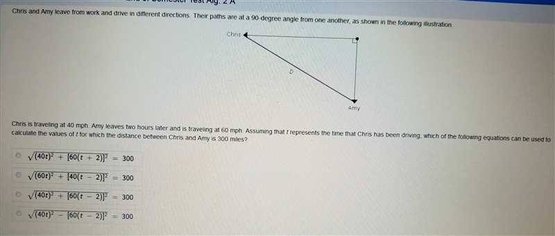 which of the following equations can be used to calculate the values of t for which the distance between Chris and any is 300 miles