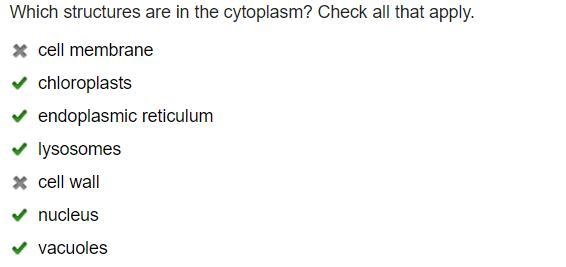 The cytoplasm contains organelles. The organelles in this list surrounded by the cytoplasm would be the endoplasmic reticulum, lysosomes, and vacuoles. The cell wall and cell membrane are outside the cytoplasm. The nucleus would also be considered in the cytoplasm. If it's talking about a human cell, then chloroplasts would not be in the cytoplasm. Only in plant cells.