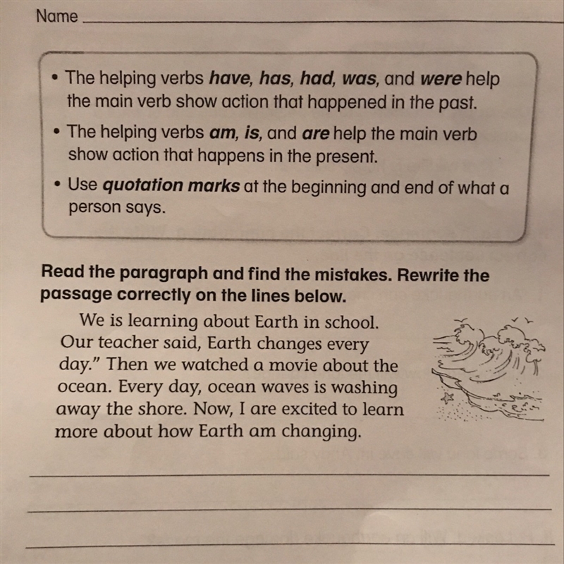 We are learning about Earth in school. Our teacher said, “ Earth changes everyday.” Then we watched a movie about the ocean. Every day, ocean waves are washing away the shore. Now, I am excited to learn more about how Earth is changing.
