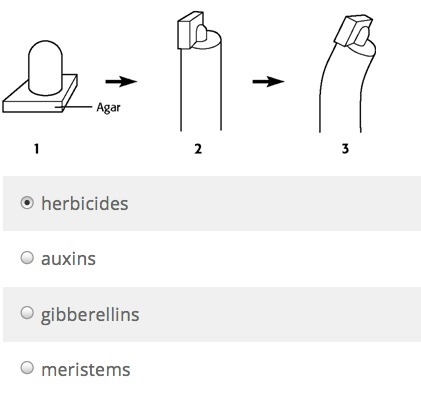 Refer to the illustration of an experiment performed to understand phototropism. The diagrams illustrate the cut tip of a seedling, which was placed onto a block of agar. In the diagram, the plant growth hormones that diffused into the agar block from the tip of the seedling are _______________.