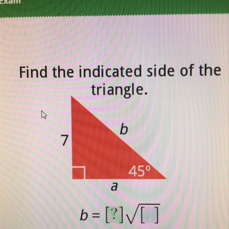 Sqrt(2)/2 = 7/b so b= 7/sqrt(2)/2= 14/sqrt(2)= 14*sqrt(2)/2= 7*sqrt(2) so the final simplified answer for the value of b= 7*sqrt(2)