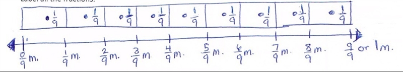 Mrs Rivera is planting flowers in her 1 meter long rectangle plant box. She divides the plant box into sections 1/9 m in length, and plants 1 seed in each section. draw and label a fraction strip representing the plant box from 0m to 1m. represent each section where Mrs. Rivera will plant a seed. label all the fractions