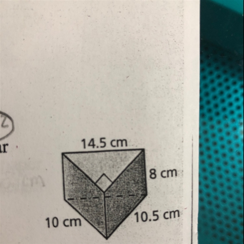 You buy a ring box as a birthday gift that is in the shape of a triangular prism. What is the least amount of wrapping paper needed to wrap the box? (My picture is above.)