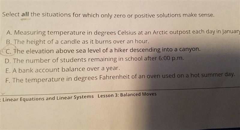 Select all the situations for which only zero or positive solutions make sense