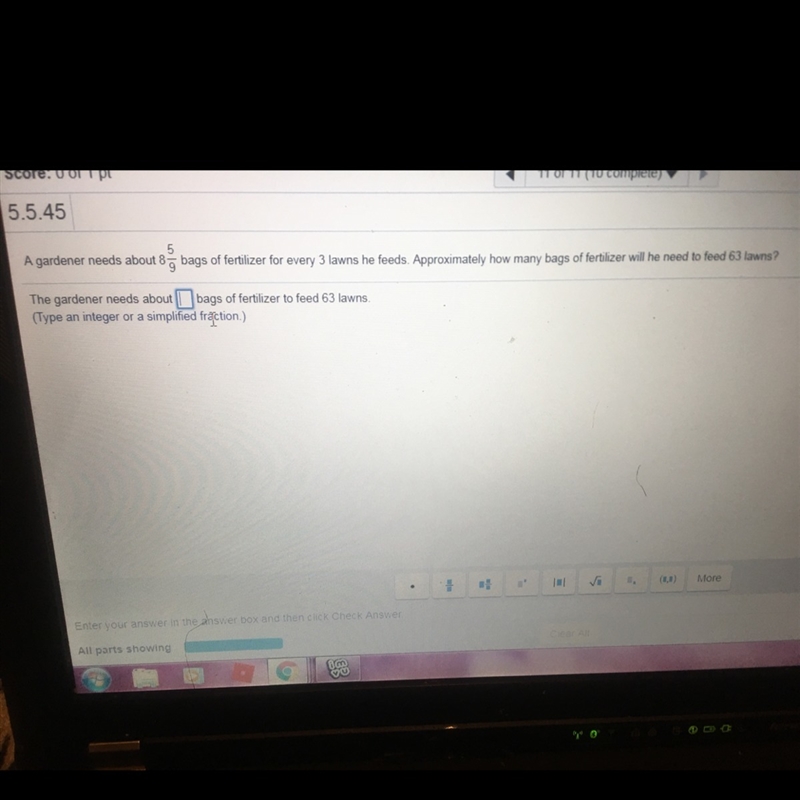 Make an improper fraction. He needs 40 / 9 bags for every lawn. 40/9 * 3/1 = ??? * 63/1