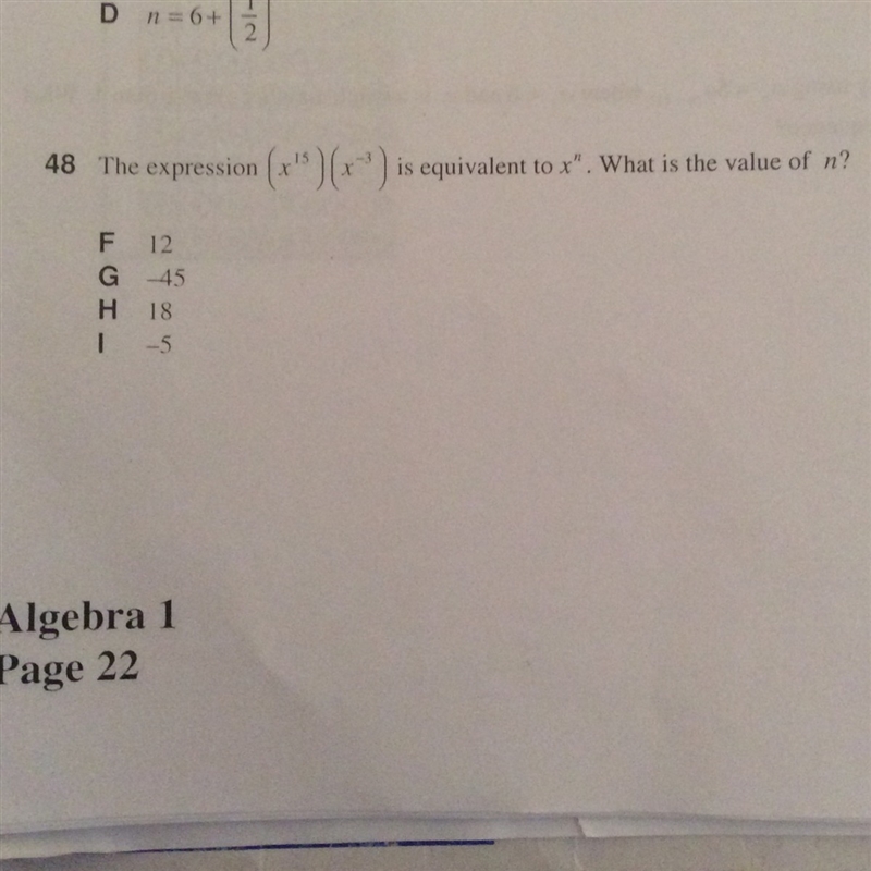 (x^15)(x^-3) = x^(15 + (-3)) = x^12
