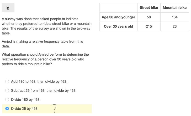 If Amjed wants to determine the relative frequency of a person over 30 years old who prefers to ride a mountain bike, he must divide the number of persons over 30 years old who prefers to ride a mountain bike by the number of persons in the experiment.