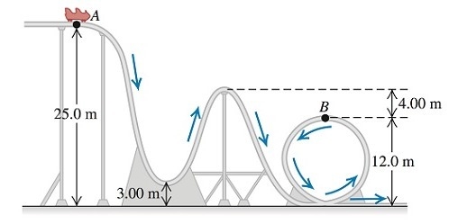You are riding on a roller coaster that starts from rest at a height of 25.0 m and moves along a frictionless track. however, after a bad storm some leaves settled on part of the track causing a 9.4-m length of the track to exert a frictional force of 625 n on the car. to safely make it around the loop, the 50-kg car must have a minimum speed of 7.7 m/s at the top of the loop (point b). how fast should the car be moving initially at point a to ensure that it reaches the top of the loop with the minimum required speed?