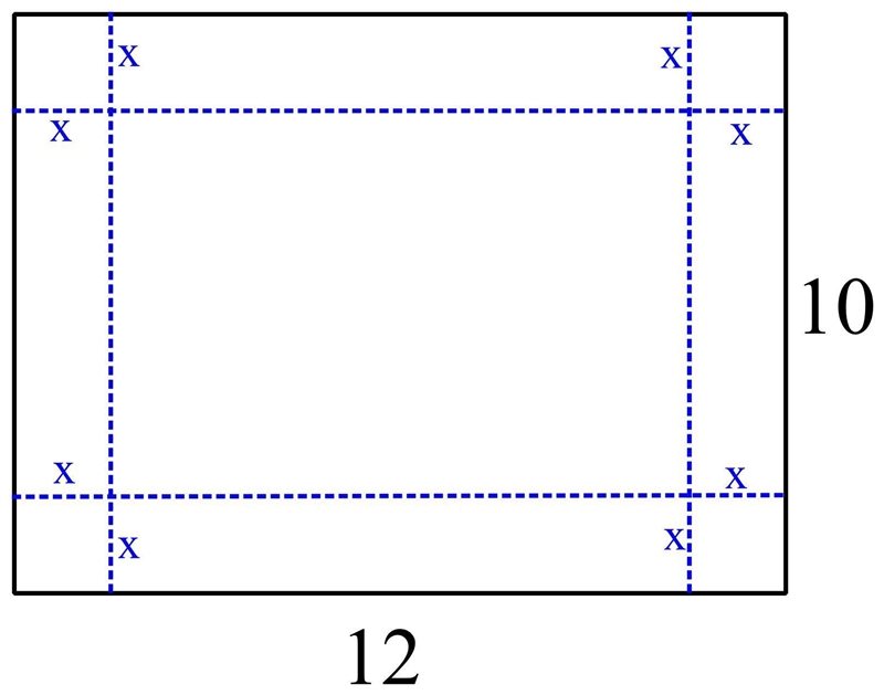 The attached figure represents the cardboard (10inches by 12 inches) and the squares that should be cut to make the box.