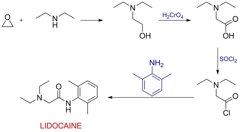 Lidocaine is prepared by the above synthesis. draw the structure of compound a in the sketchpad below.