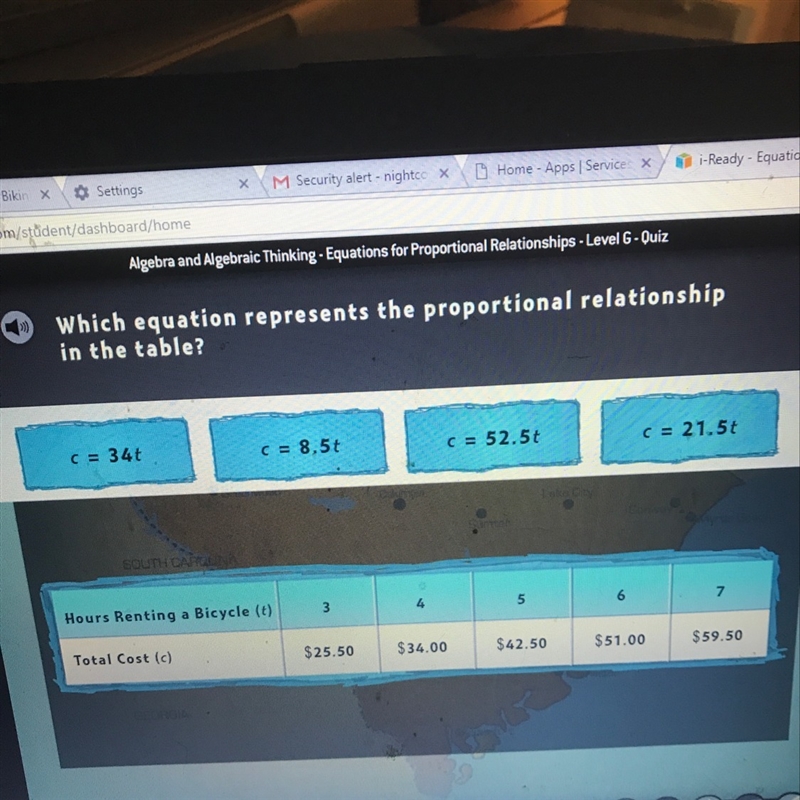 Answer: The equation that represents the proportional relationship in the table is: Second option: c=8.5t