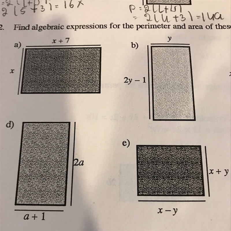 a) width= x ; length= x+7. Plug them into the formula 2( x+x+7). Combine like terms inside the parenthesis: 2(2x+7). Distributive property: 4x+14 is your answer.