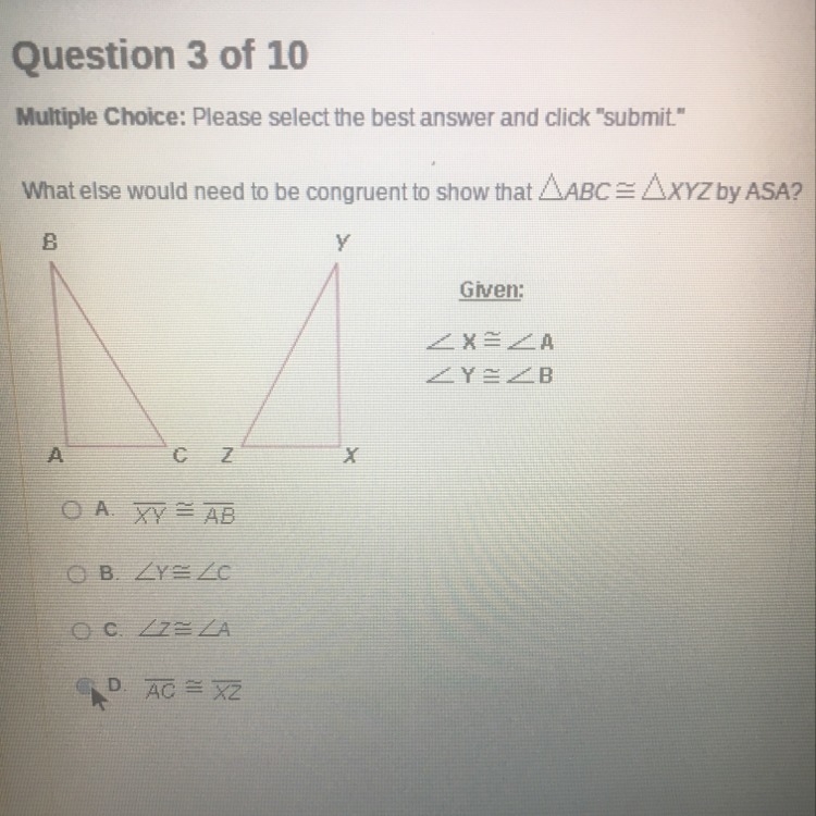 Since you have the pairs of angles X and A, and Y and B, to have ASA, you need the side between those angles.