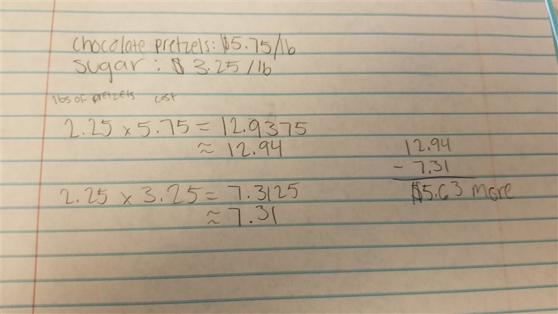 2 and 1/4 lbs of chocolate pretzels cost $5.63 more than 2 and 1/4 lbs of sugar