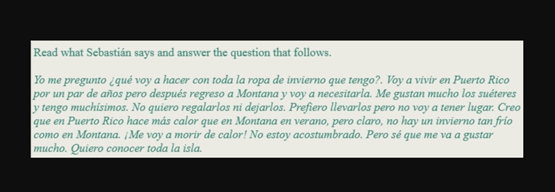 I have a question, what am I going to do with all of the cloths from winter that I have? I am going to live in Puerto Rico for a few years but after I return in Montana I am going to need them. I like the sweaters a lot and I have a lot of them. I do not want to give them away or leave them. I prefer to wear them but I do not have space. I think that Puerto Rico is more hot than Montana in the summer, but of course, there is no winter as cold as in Montana. I'm not used to it. But I know that I'm going to like it a lot. I want to know the whole island.