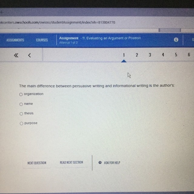 The main difference between persuasive writing and informational writing is the Author’s ______?
