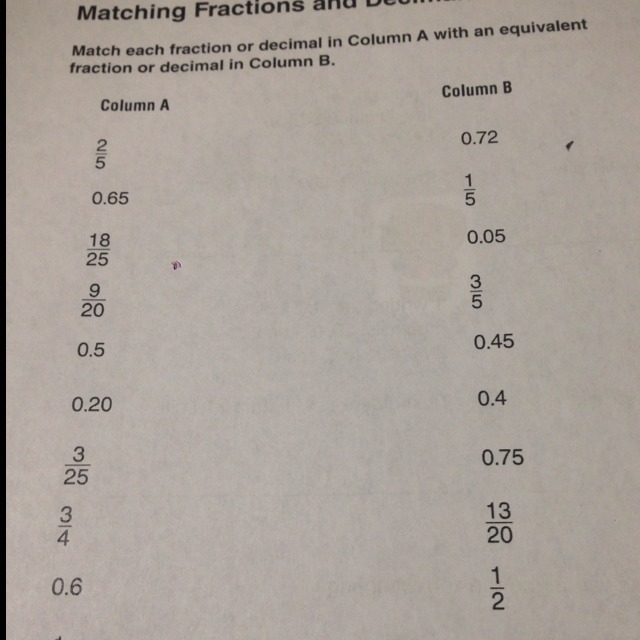 Matching fractions and decimals