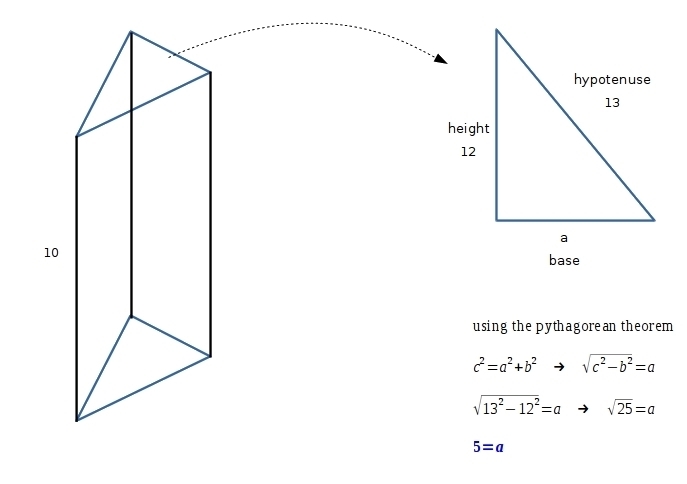 since we know the hypotenuse and one of the legs of the triangular base, we can use the pythagorean theorem to get the missing leg, namely the base of the triangle, as you see in the picture. Thus we end up with a triangle whose base is 5 and height is 12.