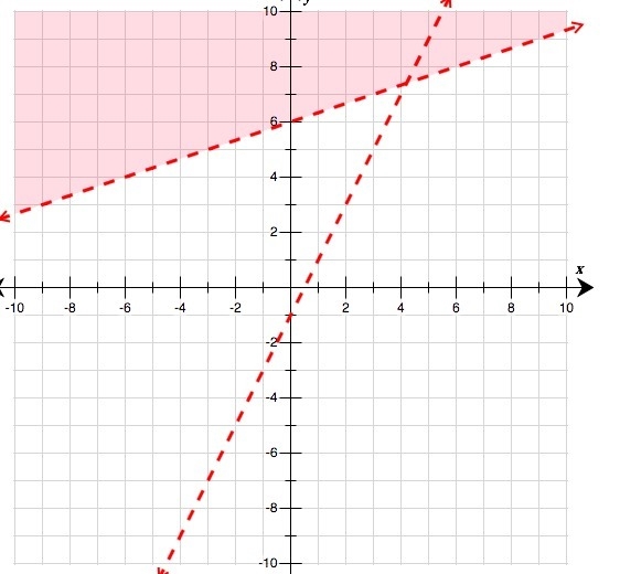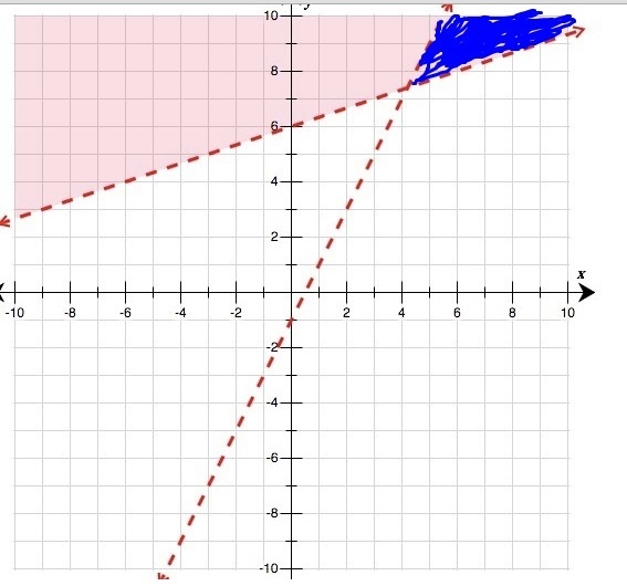 You're very close. However, the less steep line should go through (4,7) and not some point slightly above that location. Also, the shaded region should be above both dashed lines at the same time. So you won't include the portion that I've marked in blue (see attached). Other than that, it looks great.