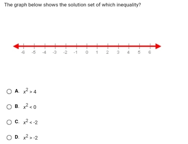 If your red line is supposed to indicate "all real numbers", none of the offered choices have that as their solution. If your red line is supposed to show the absence of any solution, then choice B is appropriate.