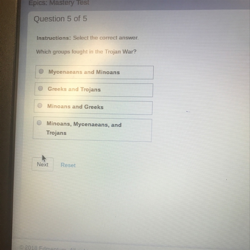 Which groups fought in the Trojan War? Mycenaeans and Minoans Greeks and Trojans Minoans and Greeks Minoans, Mycenaeans, and Trojans