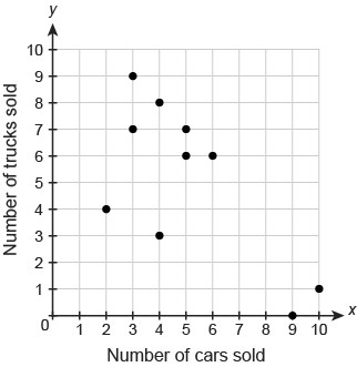 We are given a scatter plot that represents the number of cars and trucks sold by 10 different employees at a car and truck dealership during a month.
