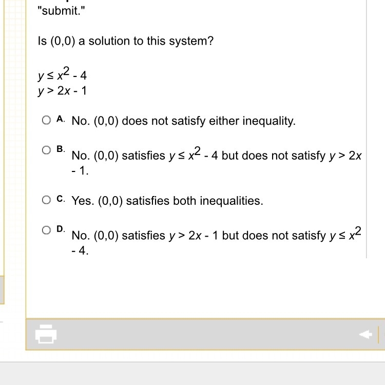 ( 0 , 0 ) is not a solution for this system since - 4 is not greater or equal to 0
